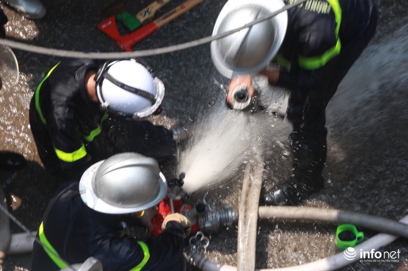 Lực lượng chức năng đang nối ống, phun nước dập lửa tại đám cháy. |