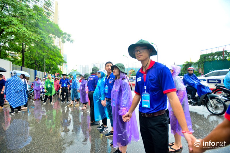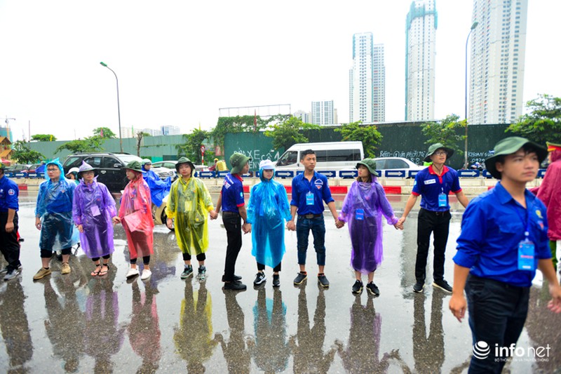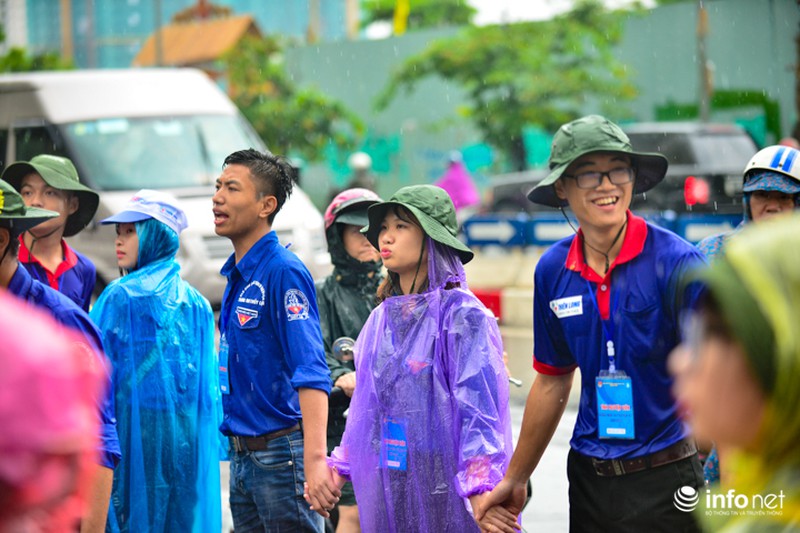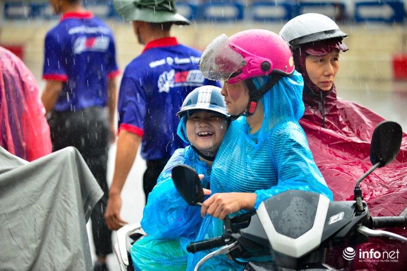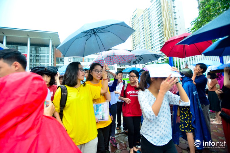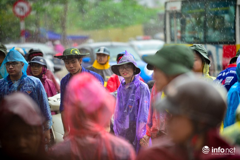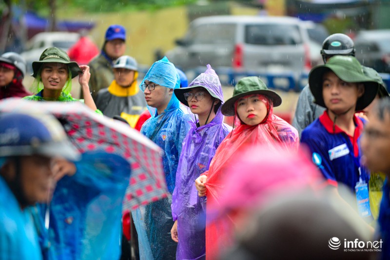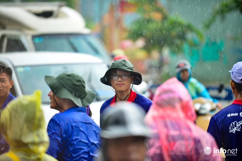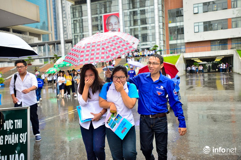 Trong ngày thi cuối cùng kỳ thi THPT Quốc gia, tại Hà Nội xuất hiện mưa rào và dông khiến việc đi lại của sĩ tử gặp nhiều khó khăn. Để thí sinh không bị ướt, các sinh viên tình nguyện đã quyết dầm mưa, đưa đón sĩ tử.