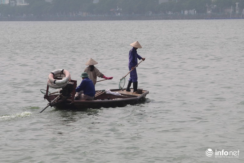 Đội công nhân vệ sinh môi trường rất vất vả đi vớt những xác cá chết này để đem đi tiêu hủy. |