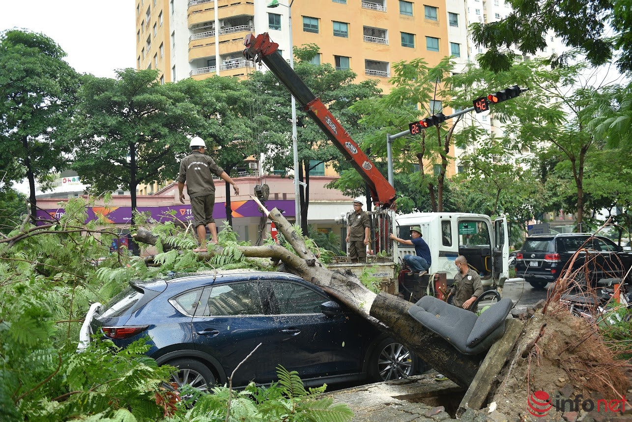 Lực lượng Công ty Công viên cây xanh Hà Nội đã có mặt tại hiện trường để cắt tỉa cây muồng, "giải cứu" xe ô tô và khai thông tuyến đường Hoàng Đạo Thúy.