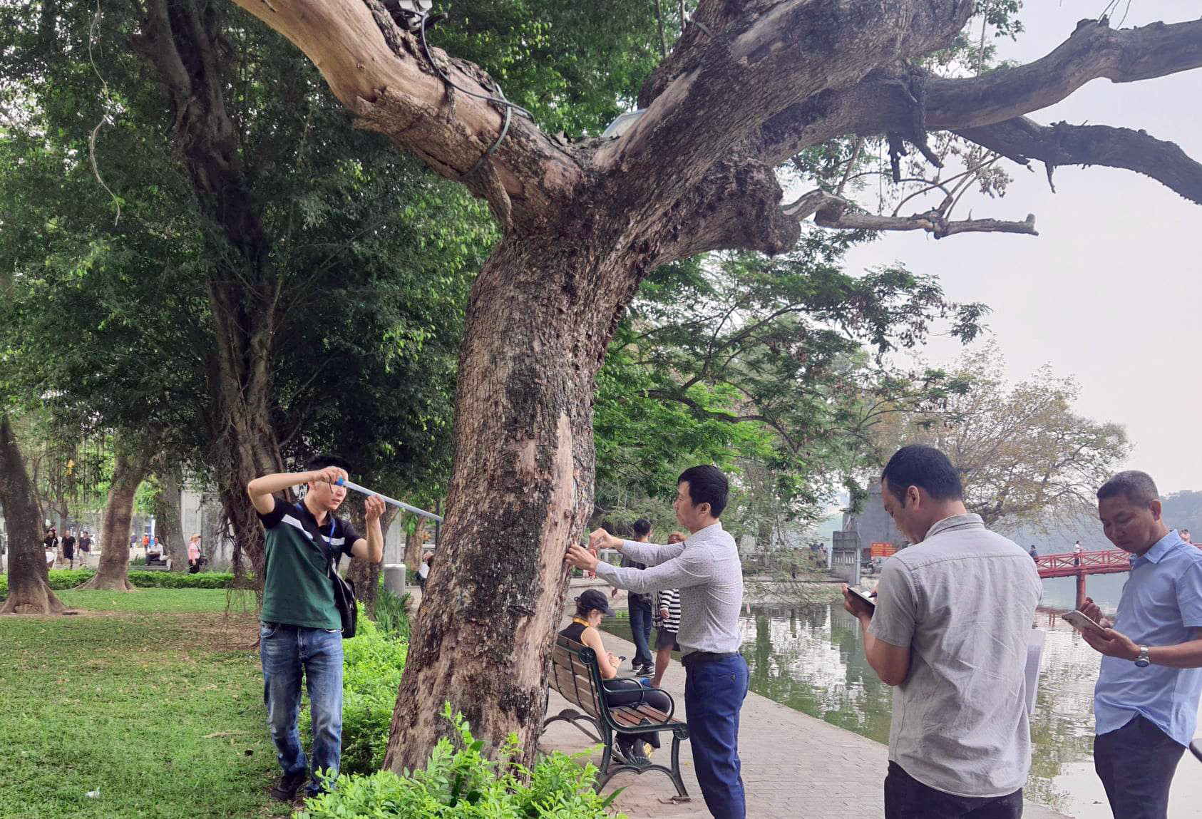 Ba cây sưa đỏ chết khô có đường kính từ 35 - 60cm dự kiến được chặt hạ vào ngày 18/4. Báo cáo trên dựa trên khảo sát của Ban Quản lý phố cổ Hà Nội về thực trạng cây xanh bên bờ hồ Hoàn Kiếm.