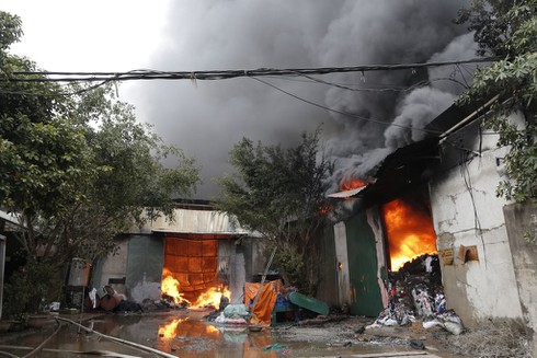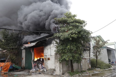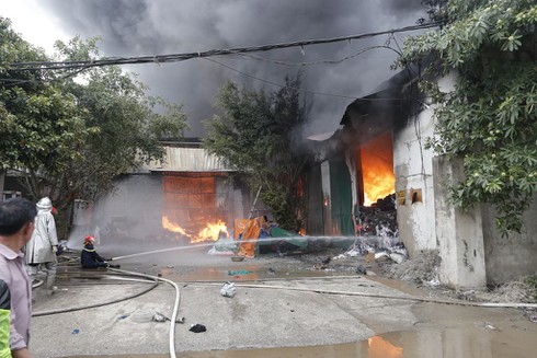 Vào thời điểm giữa trưa, trong khu xưởng lại có nhiều vật liệu dễ cháy nên ngọn lửa nhanh chóng lan rộng ra và bốc cao tạo thành cột khói lớn. |