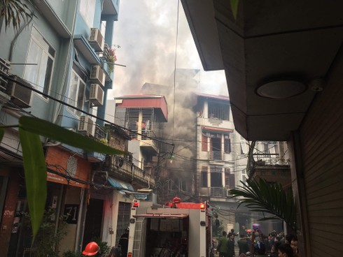 Do quán karaoke có nhiều vật liệu dễ cháy nên ngọn lửa nhanh chóng bùng lớn và cháy lan sang các nhà xung quanh. Ngay khi nhận tin báo, lực lượng CS PCCC đã có mặt tại hiện trường nhưng do đám cháy xảy ra tại khu đông dân cư, đường hẹp nên rất khó tiếp cận.