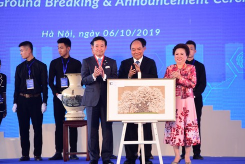 Thủ tướng Nguyễn Xuân Phúc cùng lãnh đạo các Bộ, ngành hai nước Việt Nam - Nhật Bản thực hiện nghi lễ động thổ dự án Thành phố thông minh. |