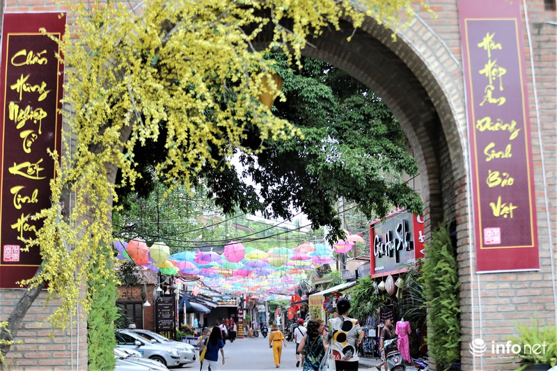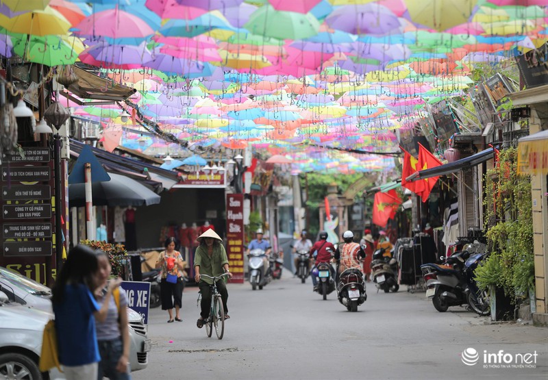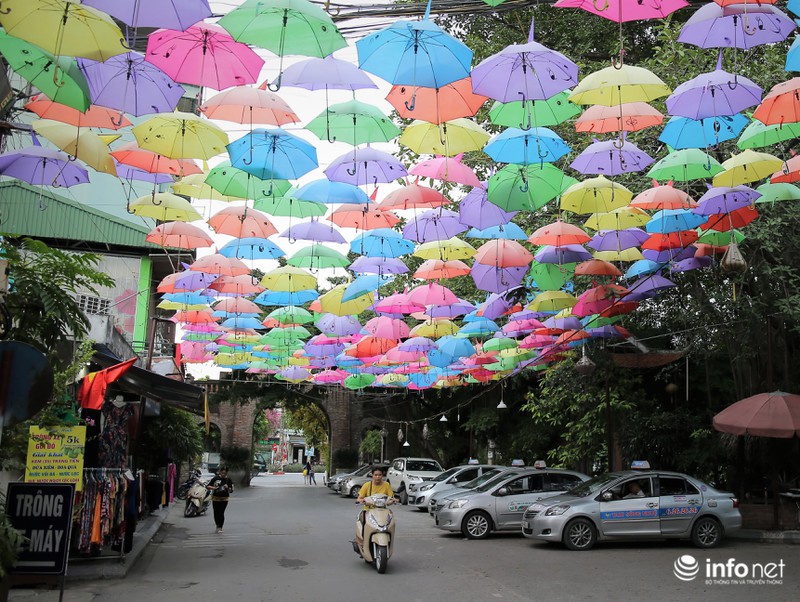 Con đường dẫn từ cổng chính tiến vào phía trung tâm của làng lụa Vạn Phúc trở nên lung linh và rực rỡ hơn với hàng nghìn chiếc ô trang trí đủ màu sắc. |