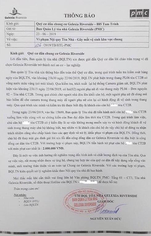 “Đây là sự việc ảnh hưởng rất nghiêm trọng đến hình ảnh và chất lượng dịch vụ của tòa nhà. Qua sự việc này rất mong được sự ủng hộ, chung tay hợp tác của quý cư dân để xây dựng nếp sống văn minh, môi trường thân thiện, an toàn tại chung cư. Với các trường hợp vi phạm ban quản lý tòa nhà kiên quyết xử lý nghiêm khắc theo nội quy tòa nhà đã ban hành”, thông báo của BQLTN chung cư Gelexia Reverside nêu rõ.