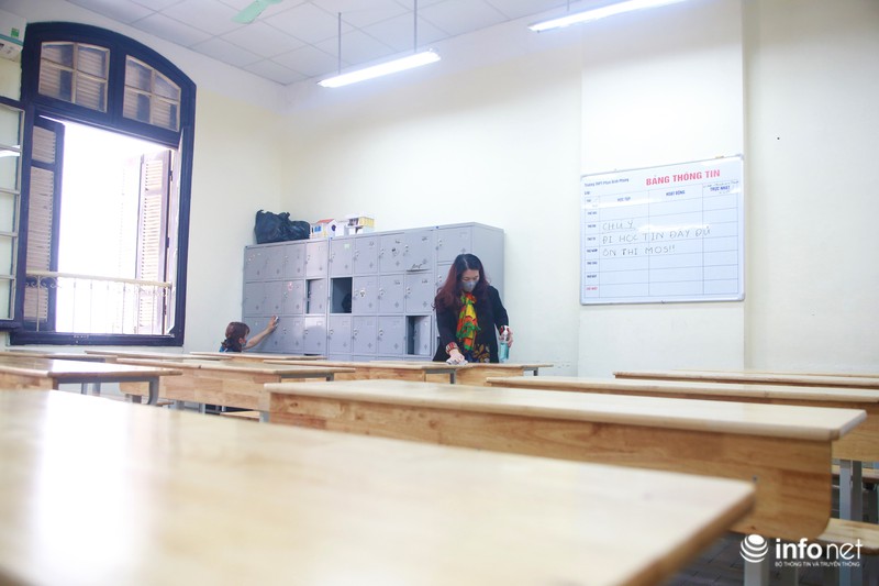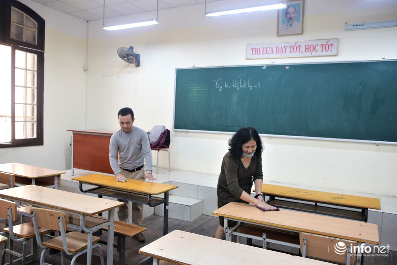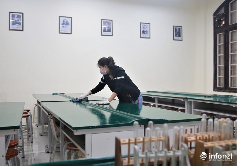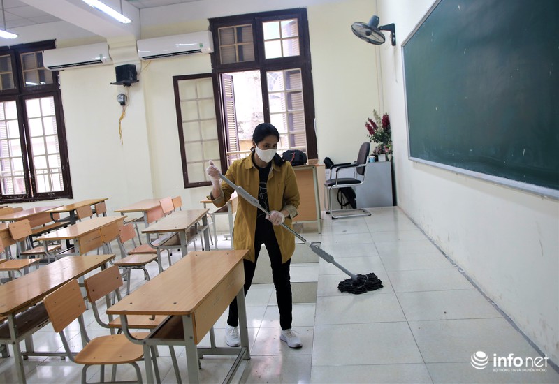 Ngày 28/2, nhiều trường học đã khẩn trương tiến hành các công đoạn dọn dẹp, khử khuẩn các phòng học, đảm bảo vệ sinh phòng chống dịch Covid-19. |