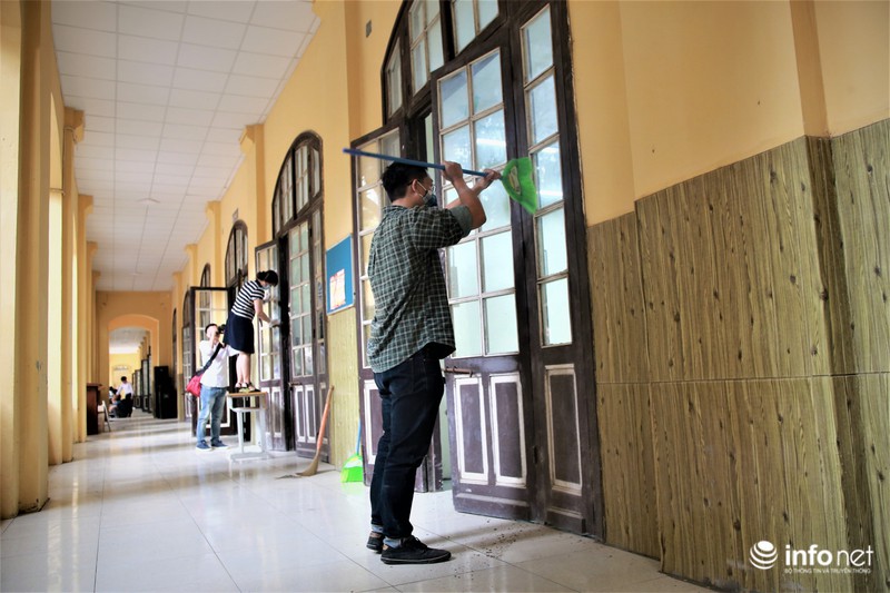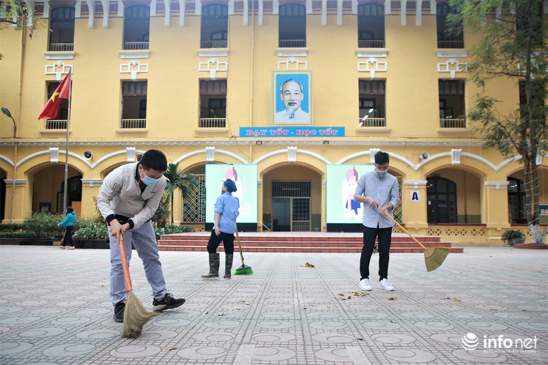 Ghi nhận của PV, tại trường THPT Phan Đình Phùng (Ba Đình, Hà Nội), công tác vệ sinh được tiến hành khẩn trương trên toàn quy mô trường. |