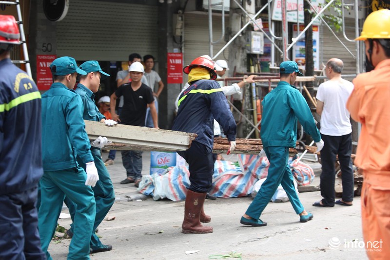 Sau khi xảy ra vụ tai nạn đến 9h15 sáng, lực lượng chức năng đã phải chốt chặn một đoạn đường trên phố Hàng Bông để thu dọn đống đổ nát.