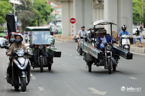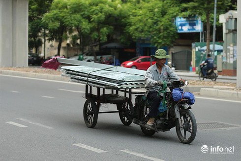 Những chiếc xe lôi chở tôn, thép xây dựng là hình ảnh thường thấy trên nhiều tuyến phố. |