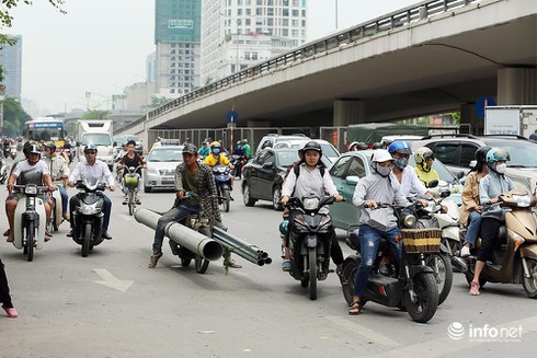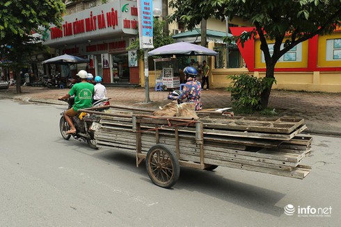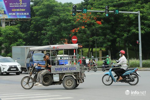 Những chiếc xe lôi chở hàng cồng kềnh nguy hiểm bon bon giữa Thủ đô không quá hiếm gặp. |