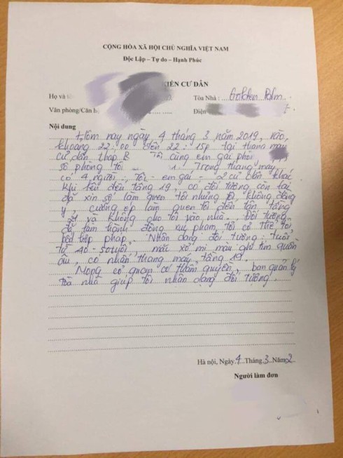 Ngay sau khi sự việc xảy ra đêm hôm đó, chị V. đã trình báo vụ việc với Ban quản lý tòa nhà và Công an phường Nhân Chính.