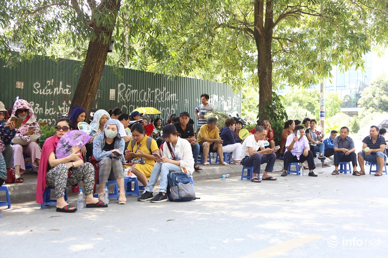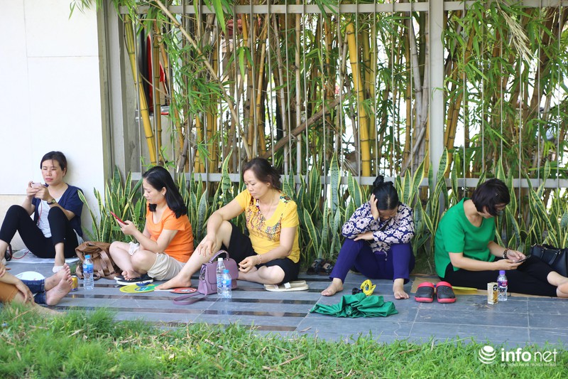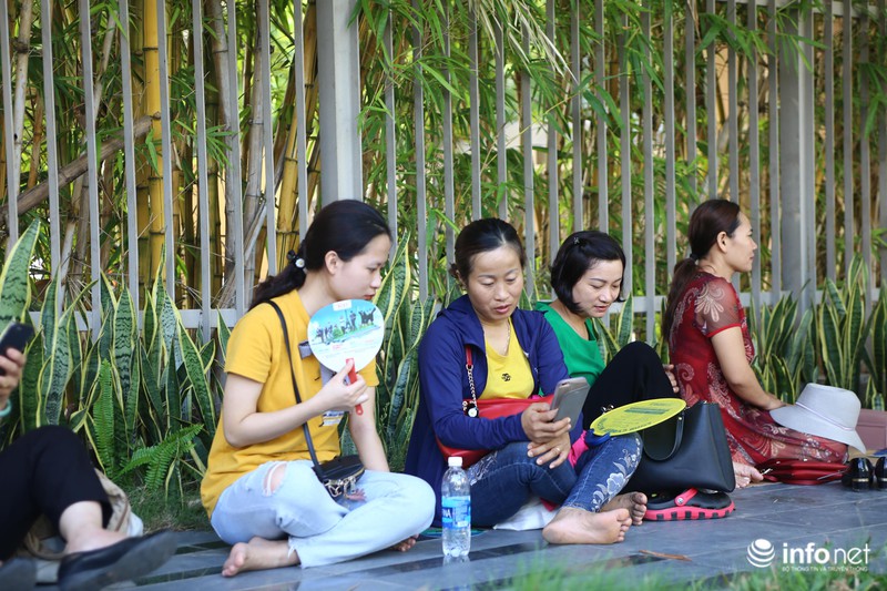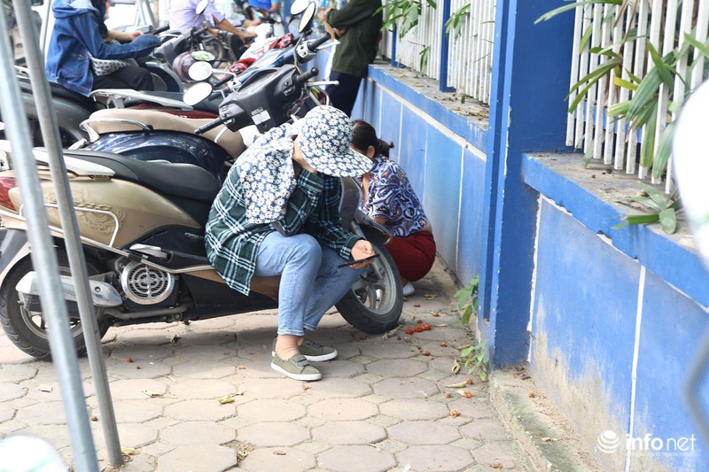 Các phụ huynh tranh thủ tận dụng từng bóng mát của cây xanh để đứng đợi con thi.