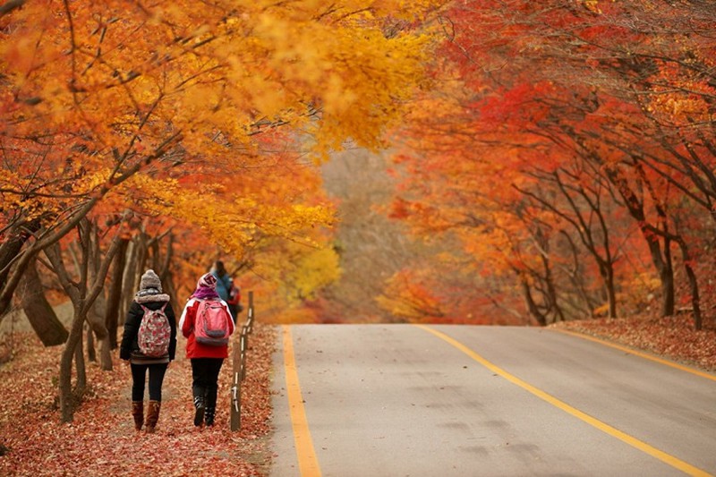 Hình ảnh hàng cây phong lá đỏ lãng mạn, màu đặc trưng của mùa Thu tại Hàn Quốc. |