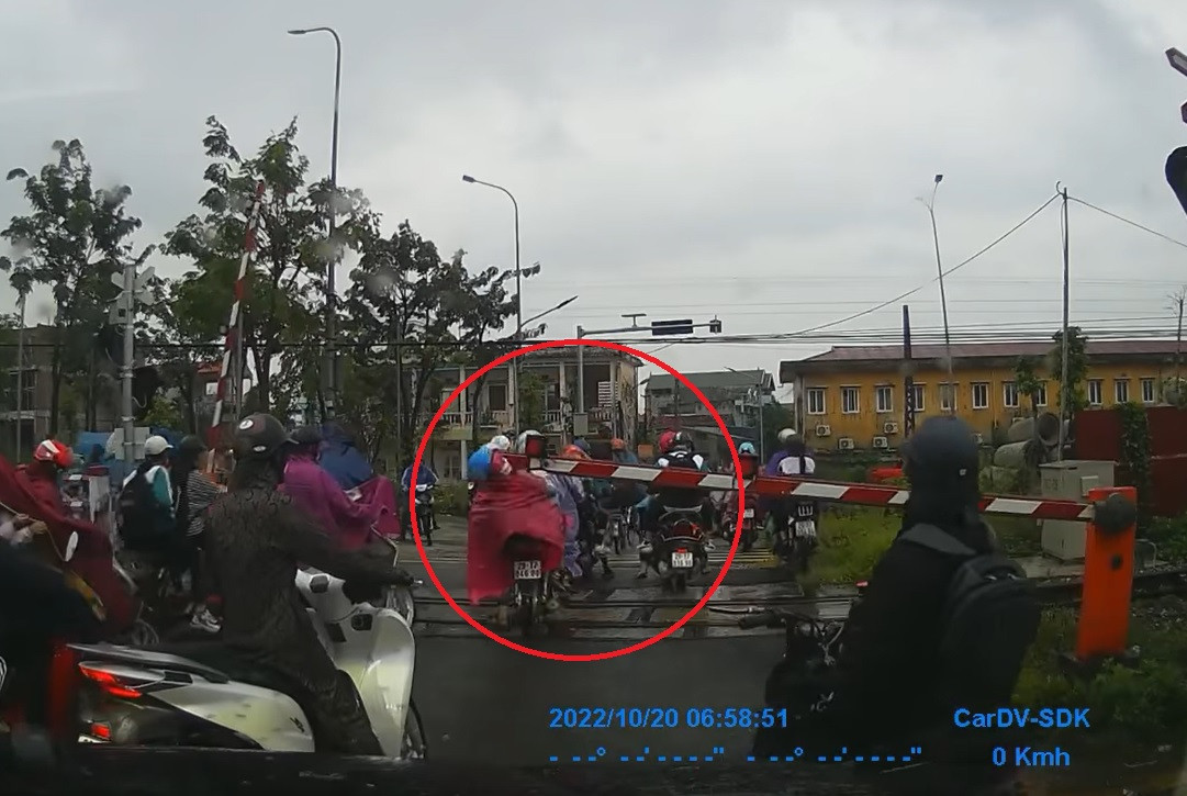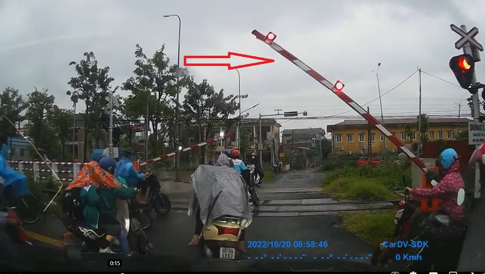 Theo clip, tại một nút giao giữa đường sắt và đường bộ, nhiều người đang đứng chờ tàu đi qua. Khi đoàn tàu đi qua, thanh chắn được nhấc lên, các xe máy lần lượt di chuyển. Thế nhưng, thanh barie khi vừa tự động nhấc lên bỗng lại hạ xuống gạt trúng vào một gia đình 3 người trên xe máy, người ngồi sau bị gạt ngửa ra sau. Rất may thanh barie bị bật ra sau không va chạm thêm với người đi đường nào khác.