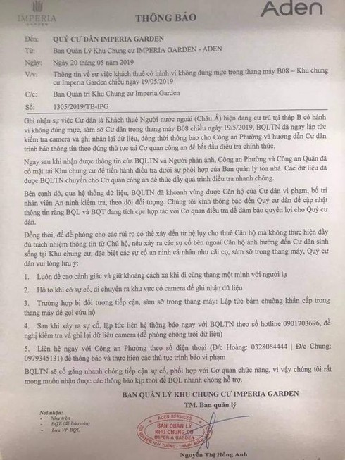 Trước đó, Ban quản lý khu chung cư Imperia Garden (Aden) dán thông báo về sự việc khách thuê có hành vi không đúng mực trong thang máy B08 khu chung cư Imperia Garden vào chiều ngày 19/5/2019.