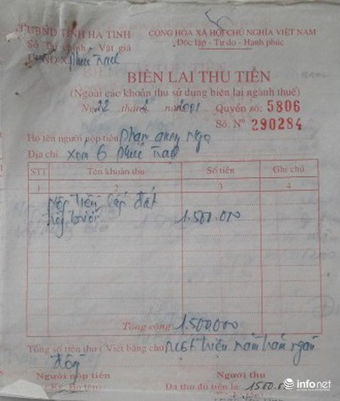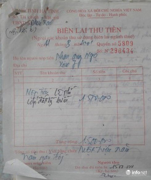 Thế nhưng, trong hai “Biên lai thu tiền” đó, một cái đề ngày 22/2/2001, ghi “người nộp tiền: Ông Phạm Quang Ngọ, địa chỉ xóm 6-Phúc Trạch”. Còn biên lai thứ 2 ghi ngày 11/8/2001 ghi “Người nộp tiền: Ông Phạm Quang Ngọ, địa chỉ xóm 7-Phúc Trạch”.