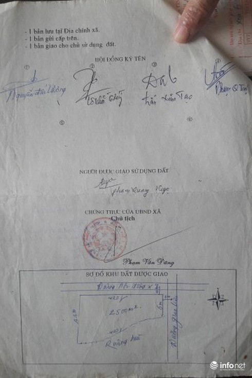 Sau khi trưng một tập giấy tờ cho PV xem, ông Ngọ giải thích: “Đất của gia đình tôi làm nhà được quy hoạch trồng bưởi năm 2001, còn đất người dân tố tôi chiếm đất Hội Phụ lão là đất ấy trước thuộc nhiều gia đình nhận canh tác, sau đó gia đình tôi đã mua lại mảnh đất đó với giá 3 triệu đồng. Thủ tục chuyển nhượng đất và phiếu nộp tiền đang đầy đủ cả đây. Dân có người ghen ăn tức ở nên không hiểu cứ đơn thư vậy thôi”.