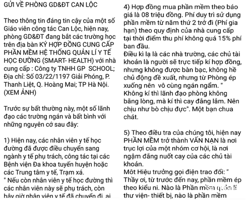 Trên trang mạng cá nhân của mình, V. L. viết: “Thông tin đáng tin cậy của một số giáo viên công tác tại huyện Can Lộc, hiện nay, phòng GD&ĐT đang bắt các trường học trên địa bàn ký hợp đồng cung cấp phần mềm hệ thống quản lý y tế học đường (Smart Health) với Công ty TNHH GP SCHOOL, địa chỉ số 03/22/1197 Giải Phóng, phường Thịnh Liệt, quận Hoàng Mai, TP Hà Nội”.