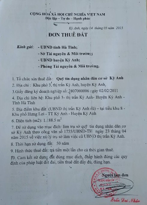 Ngày 4/5/2015, ông Trần Đại Nhân đại diện Quỹ tín dụng nhân dân cơ sở Kỳ Anh, tiếp tục có đơn xin thuê đất tại khu đất của UBND thị trấn Kỳ Anh (cũ), với diện tích 1.185,5m2