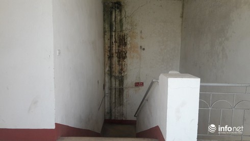 Bờ tường khu vực cầu thang lên tầng hai đã bị nứt nẻ, tường mốc rêu phong. |