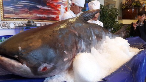 Con cá tra dầu "khủng" được chủ nhà hàng tại Hà Tĩnh mua với giá 100 triệu để về phục vụ thực khách. |