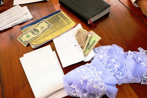 Qua kiểm tra phát hiện hai khăn trùm đầu, một số tài liệu liên quan đến hoạt động “Hội thánh Đức Chúa trời”, một phong bì bên trong chứa tiền đóng góp của các thành viên tham gia Hội thánh.