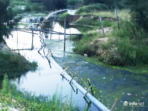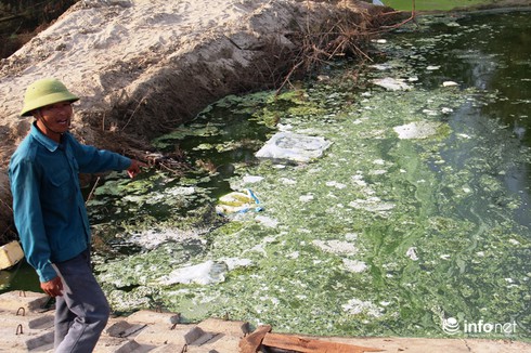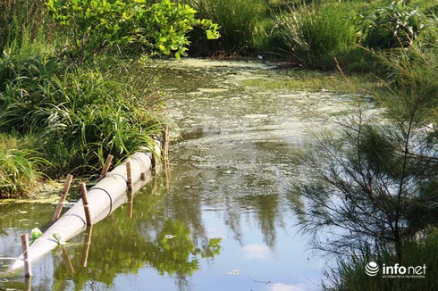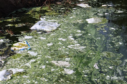 Dòng nước xanh ngòm, hôi thối, với lớp màng nổi trên mặt nước |