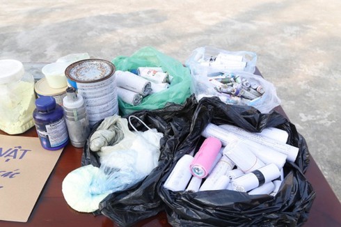 Các hóa chất và dụng cụ dùng để cuốn pháo. (Ảnh: Công an Đức Thọ) |