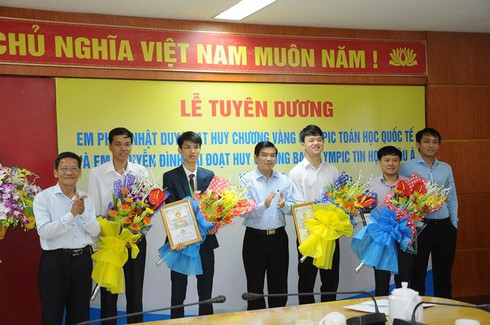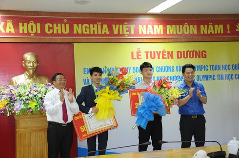 Buổi lễ chúc mừng diễn ra tại UBND tỉnh Hà Tĩnh. Lãnh đạo tỉnh Hà Tĩnh đích thân chúc mừng hai em Phan Nhật Duy và Nguyễn Đình Đại.