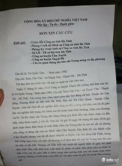 Theo đơn cầu cứu, ông Tâm trình bày: “Con trai ông là Võ Quốc Trang (SN 1992), bị cơ quan Công an huyện Thạch Hà cưỡng chế và đưa vào Trung tâm Chữa bệnh giáo dục lao động xã hội tỉnh Hà Tĩnh (Thuộc Sở LĐTB&XH Hà Tĩnh) ở xã Cẩm Quan, huyện Cẩm Xuyên vào ngày 11/1/2018 để cai nghiện. Khi Công an đến cưỡng chế đưa con tôi đi giáo dục cai nghiện thì tình trạng sức khỏe con tôi vẫn bình thường. Từ khi vào Trung tâm, hàng tháng gia đình đều vào thăm và đều thấy cháu khỏe mạnh, ý chí tốt”.