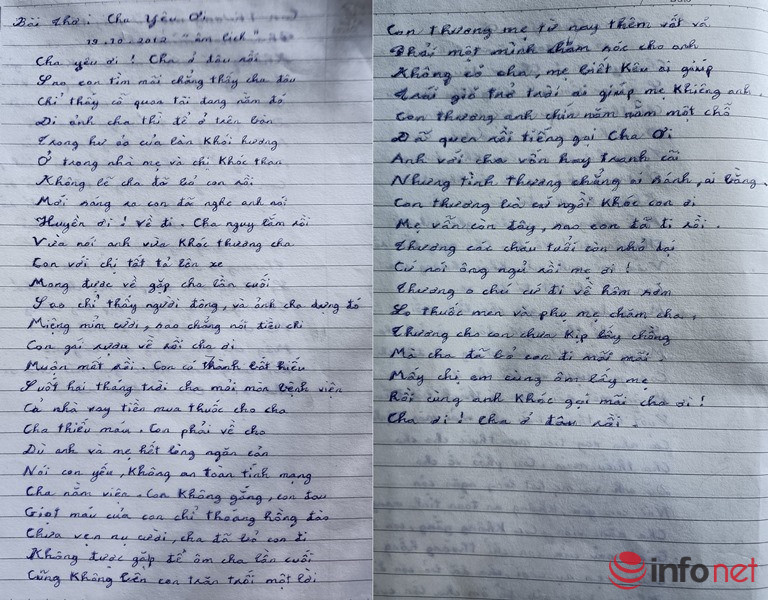 “Vẽ được khá nhiều tranh rồi em lại quay ra viết chữ ký, làm thơ. Bài thơ em tâm đắc nhất là “Cha yêu ơi”, được viết vào thời điểm cha em qua đời. Lúc đó mọi người đang tập trung lo tang sự bên ngoài, em không ra được mà nằm một mình lạc lõng trong nhà, tủi thân rồi khóc. Khi mọi người bế em vào vuốt mắt cho cha, ánh mắt của cha nhìn em cứ hiện lên trong đầu nên em viết bài thơ đó”. Kể đến đây, giọng của Long như nghẹn lại.