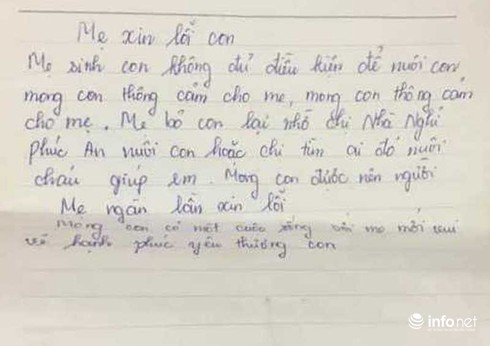 Bức thư có nội dung “Mẹ xin lỗi con, mẹ sinh con không đủ điều kiện để nuôi con, mong con thông cảm cho mẹ. Mẹ bỏ con lại nhờ chị nhà nghỉ Phúc An nuôi con hoặc chị tìm ai đó nuôi cháu giúp em. Mong con được nên người. Mẹ ngàn lần xin lỗi. Mong con có một cuộc sống với mẹ mới vui vẻ và hạnh phúc yêu thương con”.