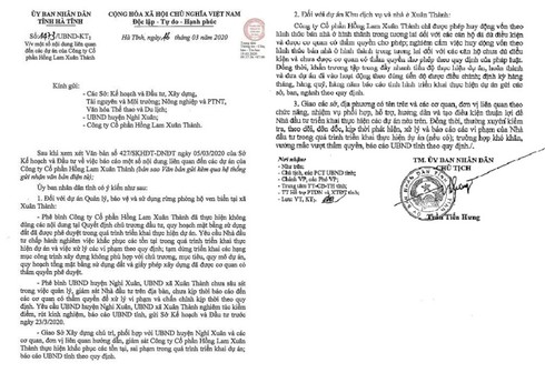 Chủ tịch UBND tỉnh Hà Tĩnh giao Sở Xây dựng chủ trì, phối hợp với UBND huyện Nghi Xuân và các cơ quan, đơn vị liên quan hướng dẫn, giám sát Công ty Cổ phần Hồng Lam Xuân Thành thực hiện khắc phục các tồn tại, sai phạm trong quá trình triển khai dự án; báo cáo UBND tỉnh theo quy định.