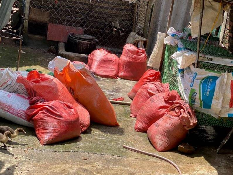 Quá trình kiểm tra, lực lượng chức năng phát hiện tại khu vực chăn nuôi của gia đình bà Nguyễn Thị Lương có 9 bao tải màu đỏ và 24 bao tải màu xanh đựng mỡ bò (khoảng hơn 1 tấn) đã được chế biến.