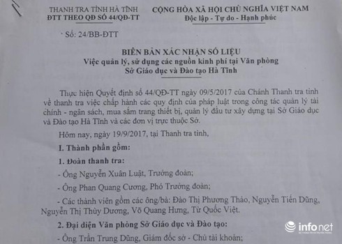 Theo “Biên bản xác nhận số liệu về việc quản lý, sử dụng các nguồn kinh phí tại Văn phòng Sở Giáo dục và Đào tạo Hà Tĩnh” số 24/BB-ĐTT, ngày 25/11/2017 của Thanh tra tỉnh Hà Tĩnh, từ năm 2014 đến 2016 có những sai phạm như sau: