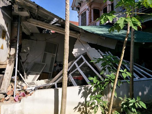 Tại hiện trường, tường rào bằng bê tông và mái che sân có trụ bê tông của gia đình ông Nguyễn Hữu Nhâm bị đổ sập. Phía trong sân nhà này có một chiếc xe ô tô 4 chỗ, 2 xe máy cùng nhiều vật dụng khác bị tường và mái đổ sập đè lên hư hỏng.