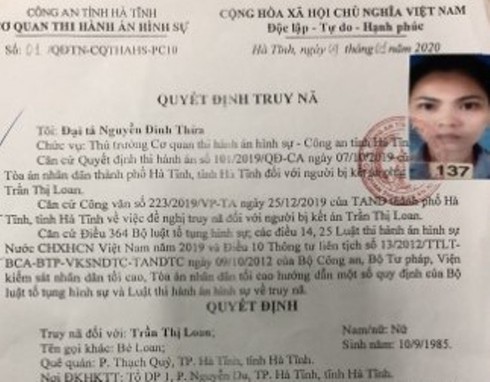 Đại tá Nguyễn Đình Thừa, Thủ trưởng Cơ quan Thi hành án Hình sự Công an tỉnh Hà Tĩnh vừa ra Quyết định số 01/QĐTN-CQTHAHS-PC10 về việc truy nã đối tượng Trần Thị Loan, tên gọi khác: Bé Loan (SN 1985, quê quán: phường Thạch Quý, TP Hà Tĩnh; nơi ĐKHKTT: TDP1, phường Nguyễn Du, TP Hà Tĩnh.