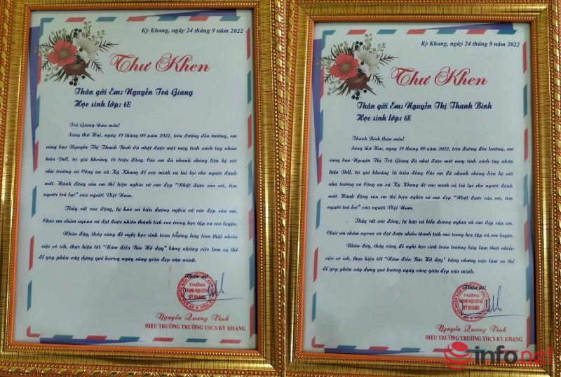 Như Infonet đã đưa tin, vào ngày 19/9/2022, trên đường đi học (đoạn qua thôn Đồng Tiến, xã Kỳ Khang, huyện Kỳ Anh), em Nguyễn Trà Giang và Nguyễn Thị Thanh Bình (cùng sinh năm 2011, trú tại thôn Sơn Hải, xã Kỳ Khang) đã nhặt được 1 chiếc laptop nhãn hiệu DELL, trị giá khoảng 16 triệu đồng.