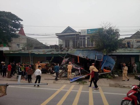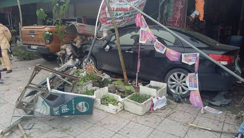 Khi leo lên gờ vỉa hè, chiếc xe này bị nổ một lốp rồi tiếp tục chạy khoảng 10m thì đâm vào chiếc xe máy biển số 38F8-3874 dựng trên vỉa hè. Tiếp đó, chiếc xe ô tô này lao tới khu vực bán hàng tạp hóa của một nhà dân, đâm vào chiếc xe máy biển số 38C1-234-31.