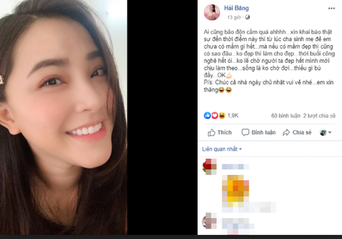Đáp trả cho mọi tin đồn, mới đây Hải Băng đã đăng tải trên trang cá nhân hình ảnh cận đường cằm thon dài của mình kèm lời giải thích: "Ai cũng bảo độn cằm quá à. Xin khai báo thật sự đến thời điểm này thì từ lúc cha sinh mẹ đẻ em chưa có mần gì hết".