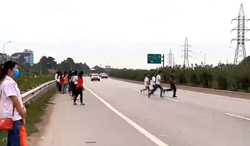 | Công nhân Khu công nghiệp Vân Trung, huyện Việt Yên, Bắc Giang hồn nhiên băng qua cao tốc bất chấp nguy hiểm. |