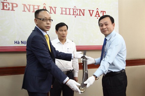 Ông Vương Quỳnh Xuân, cháu đích tôn của vua Mèo Vương Chí Sình, trao tặng lại kỷ vật cho Bảo tàng Hồ Chí Minh. |