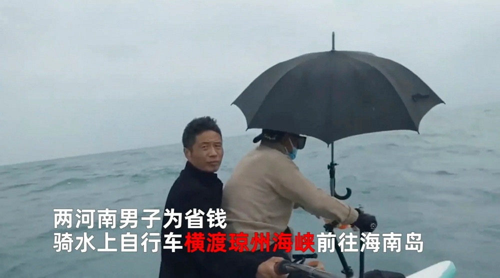 Theo Star Video, một người đàn ông có tên trên mạng xã hội là Brother Stone và người khác mang họ Zhou đã đạp xe đạp nước từ huyện Từ Văn của tỉnh Quảng Đông dọc theo eo biển Quỳnh Châu để tới thành phố Hải Khẩu trên đảo Hải Nam vào ngày 31/12/2022.