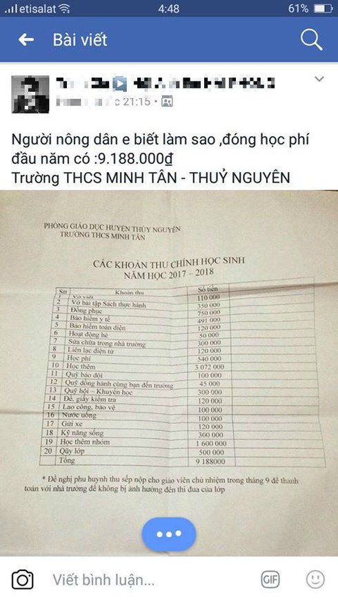 Một phụ huynh khác bình luận: “Nộp gì mà kinh khủng vậy, thế này nhà nghèo sao dám cho con đi học? Học thêm không biết có được chữ nào không mà những 3 triệu, tiền thư điện tử 60 nghìn đồng đã thấy cao rồi chứ nói đến việc thu những 120 nghìn. Không biết, một năm phụ huynh nhận được mấy tin nhắn và còn rất nhiều khoản vô lý.