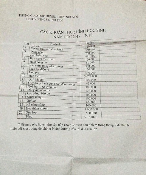 Chỉ trong thời gian ngắn nhưng thông báo này đã thu hút sự quan tâm của rất nhiều phụ huynh. Tờ thông báo được cho là của Trường THCS Minh Tân (huyện Thủy Nguyên, Hải Phòng) thu các khoản đầu năm lên tới gần 10 triệu đồng các khoản đóng đầu năm như tiền sách vở, tiền học thêm, mua BHYT, nước uống....