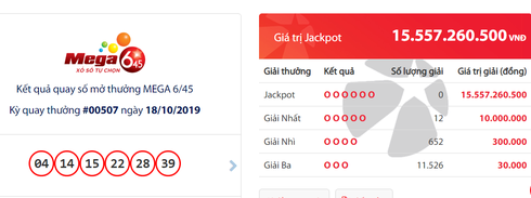Hội đồng mở thưởng xác định dãy số trúng Jackpot là 04 – 14 - 15 - 22 - 28 - 39 nhưng đã không tìm được chủ nhân may mắn nào trùng giải thưởng Jackpot đang có giá trị 15.557.260.500 đồng.
