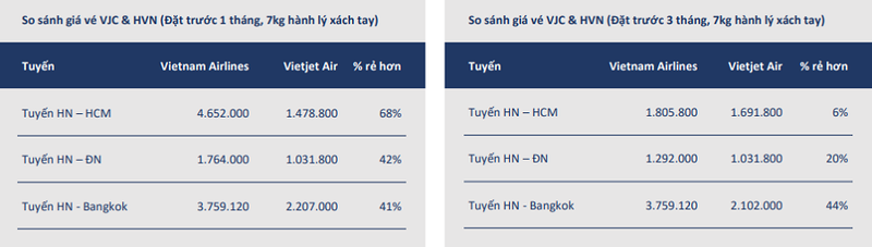 So sánh giá vé giữa Vietjet Air (VCJ) và Vietnam Airlines (HVN). Nguồn: BVSC tháng 1/2018. |