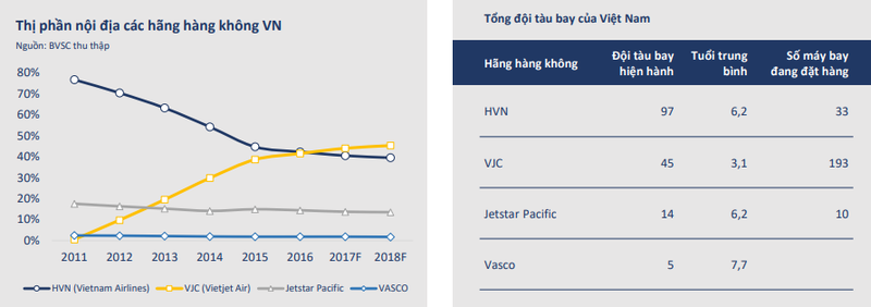 Thị phần nội địa của các hãng hàng không Việt Nam. Nguồn: BVSC tháng 1/2018. |