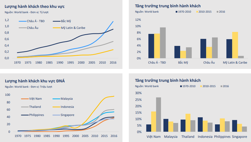 Thị trường hàng không Đông Nam Á có mức tăng trưởng nhanh nhất thế giới nhờ hàng không giá rẻ. Nguồn: BVSC tháng 1/2018. |
